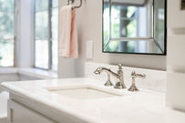 The master retreat was recently remodeled and features a fireplace and French doors to a private wisteria-covered patio. The master bath is a swoon-worthy, spa-like dream. Custom white cabinetry is topped with Carrera marble counter and polished nickel Kohler fixtures. The view from the stand-alone soaker tub is heavenly and the large, marble tiled shower boasts high-end fixtures as well. The floor features encaustic cement tile in gray and white. Custom window treatments are throughout the home. There are three additional bedrooms, hallway bath with two sinks, and a recently remodeled powder room.
